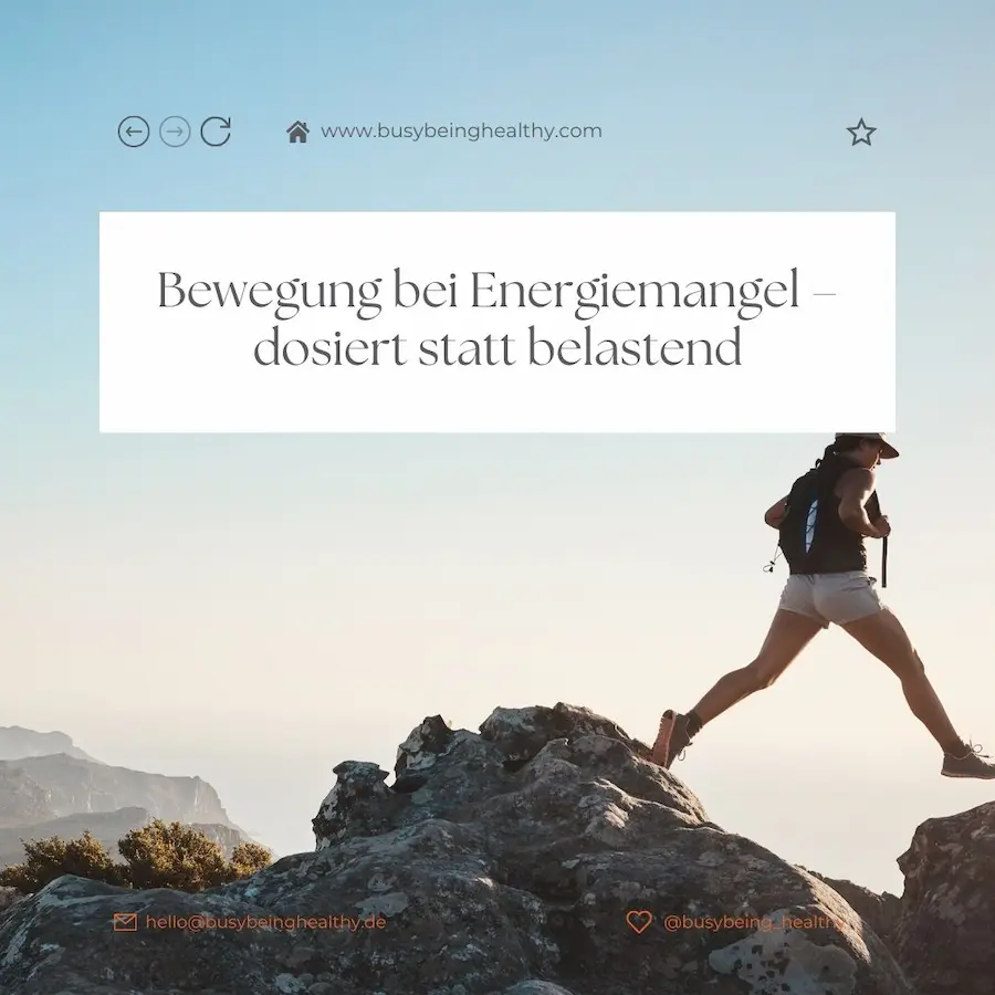 Bewegung bei Energiemangel: Dosiert statt belastend | Busy Being Healthy Bewegung bei Energiemangel: Wie du aktiv bleibst, ohne dich zu überfordern Bewegung bei Energiemangel ist möglich — aber nur, wenn sie richtig dosiert wird. Was bei gesunden Menschen funktioniert, kann bei chronischer Erschöpfung das Gegenteil bewirken. Hier erfährst du, wie du dich sinnvoll bewegst, ohne […]